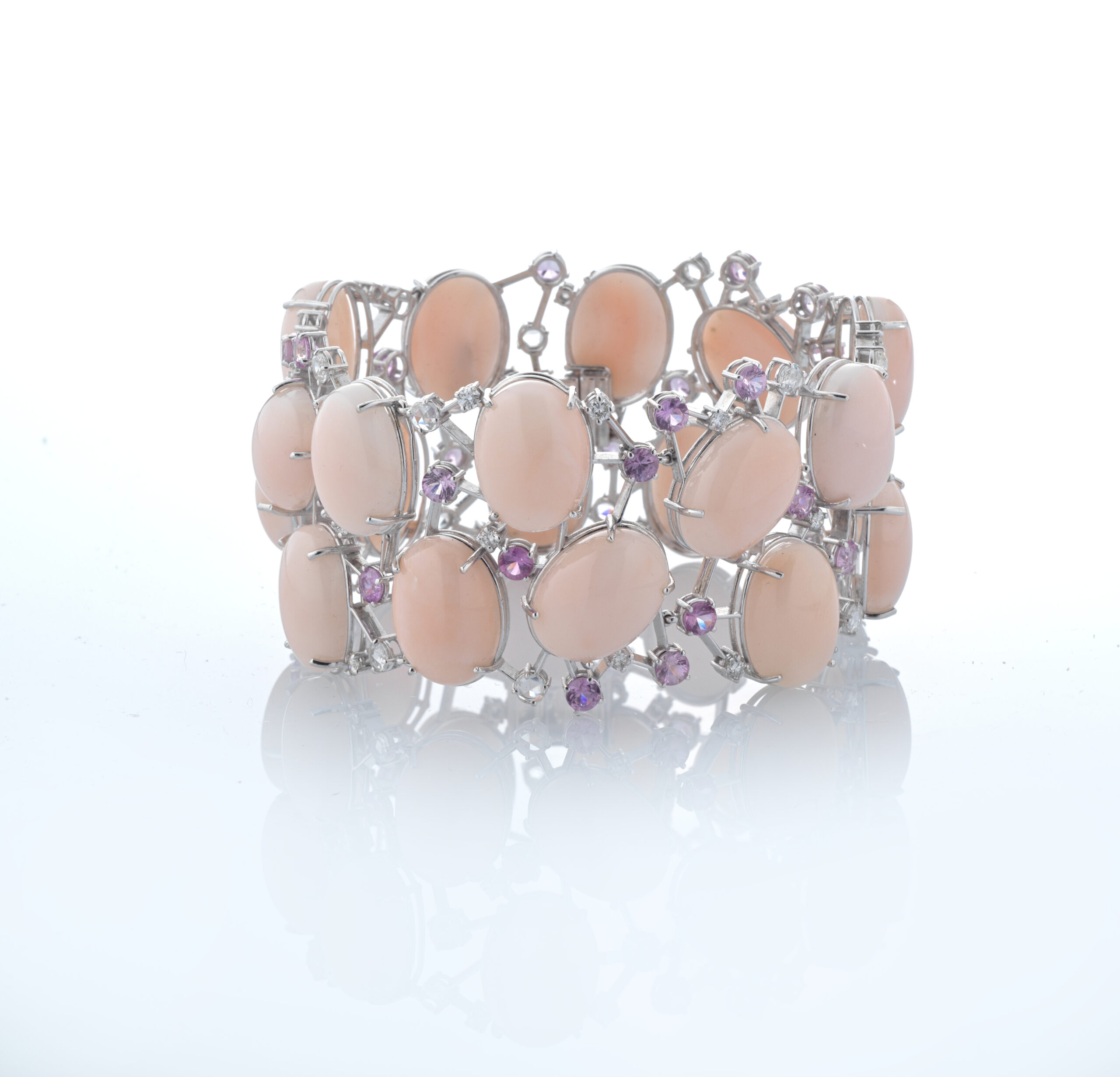 Bracciale in oro 18 kt, corallo rosa, zaffiri e diamanti