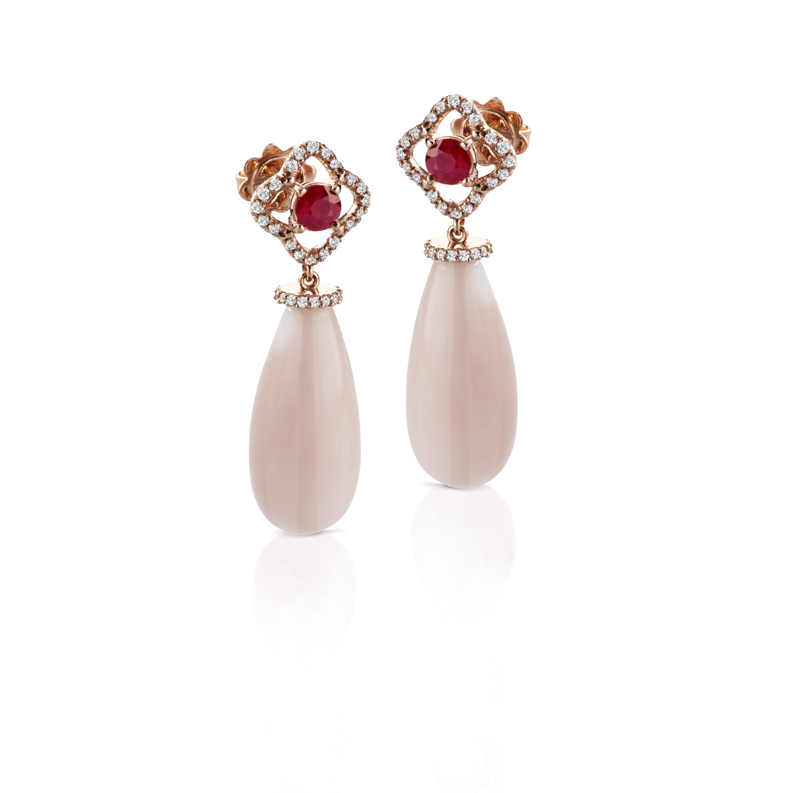 Orecchini in oro 18 kt, corallo rosa, rubini e diamanti