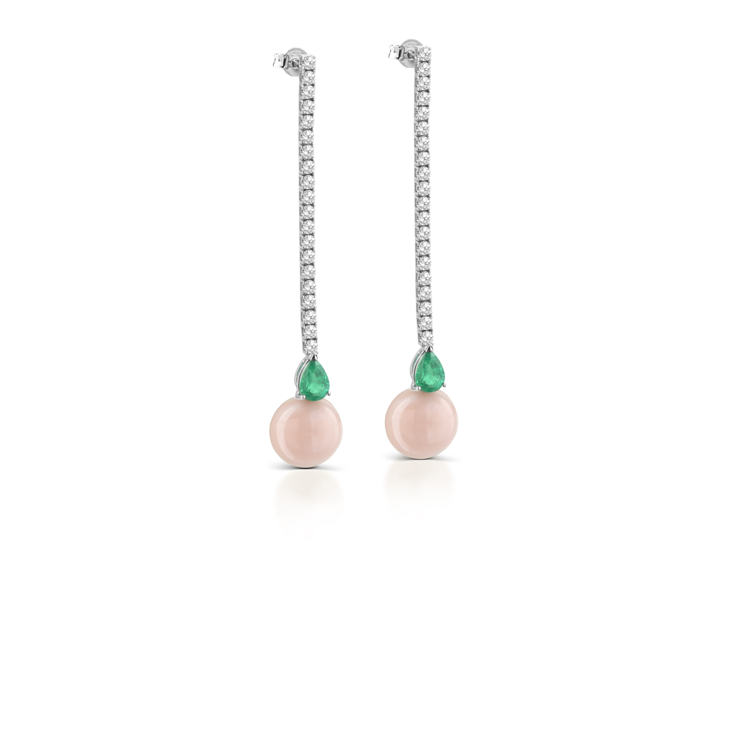 Orecchini in oro 18 kt con corallo rosa, smeraldi kt. 1,36 e diamanti kt. 1,55