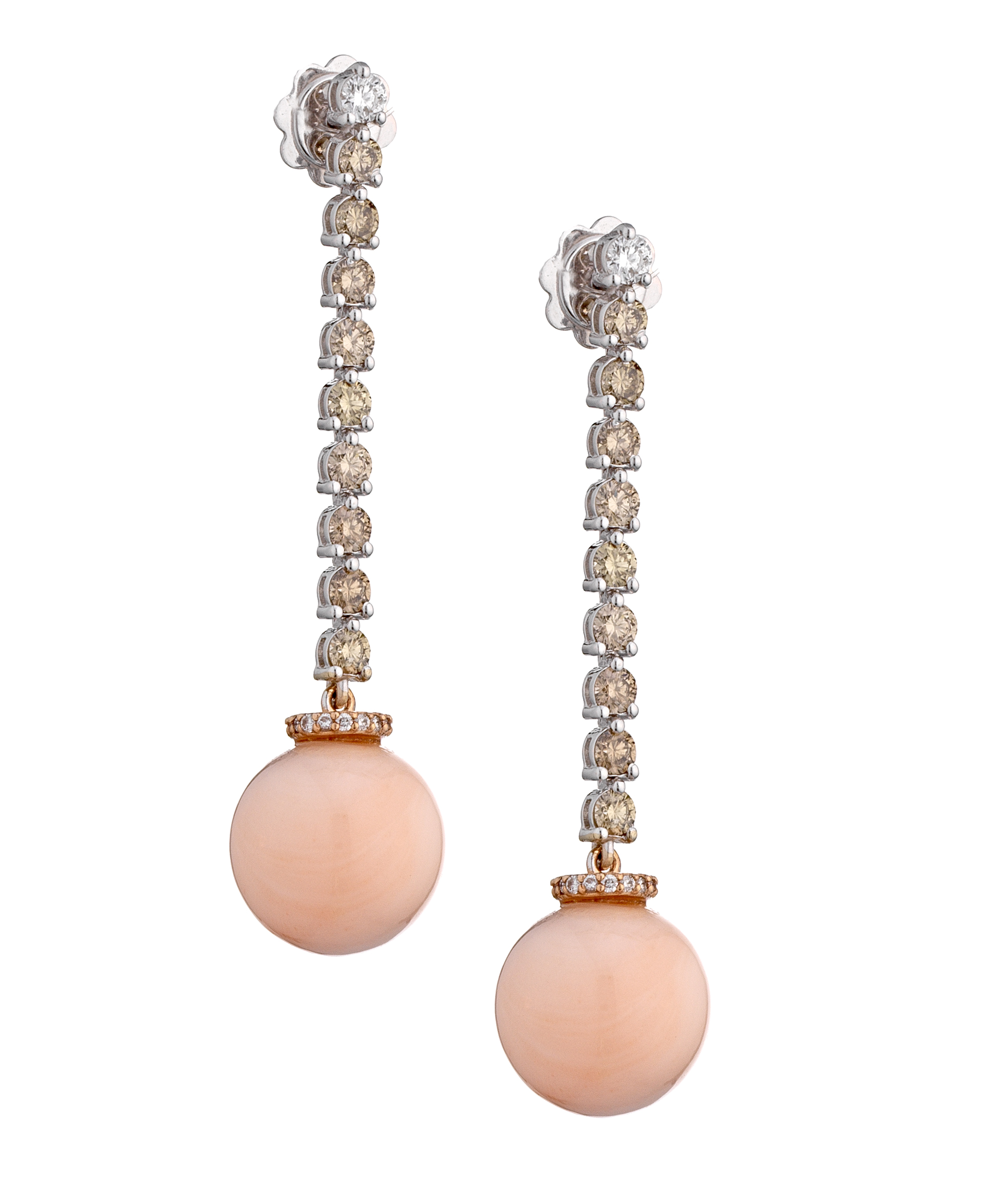 Orecchini in oro 18 kt con corallo rosa, diamanti brown kt. 1,04 e diamanti bianche kt. 0,27