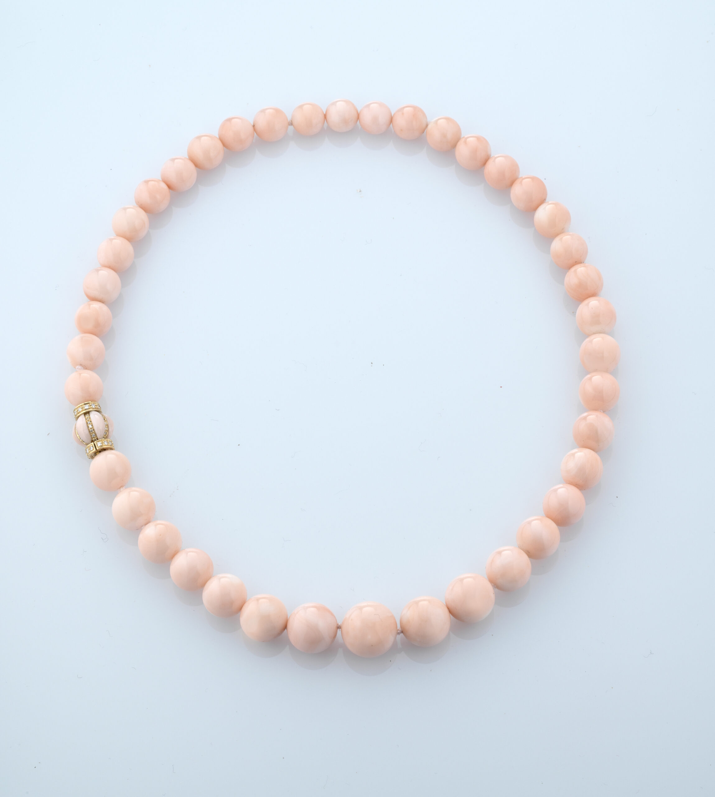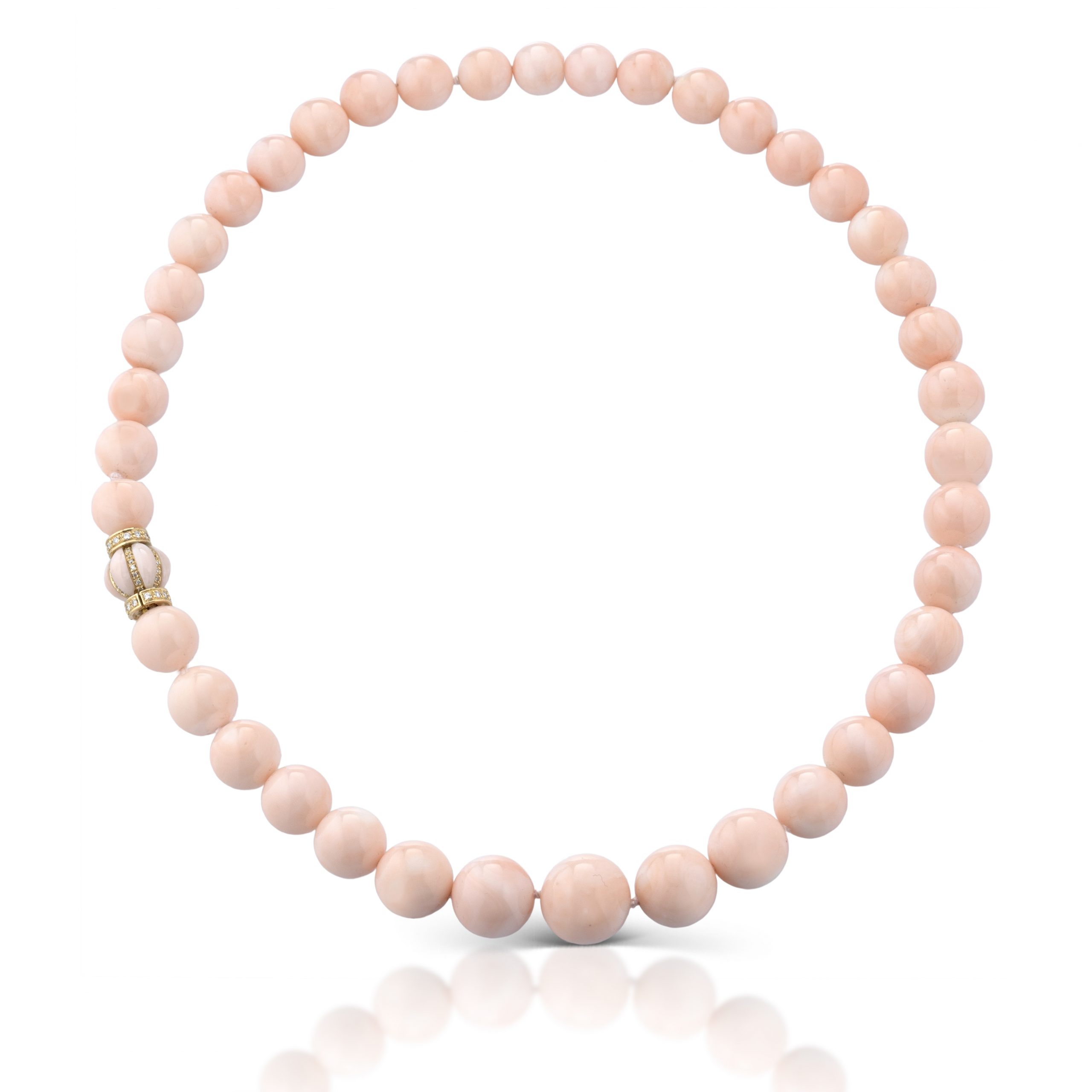 Collana in corallo rosa “pelle d’angelo” con chiusura in oro 18 kt con corallo rosa e diamanti kt. 0,35