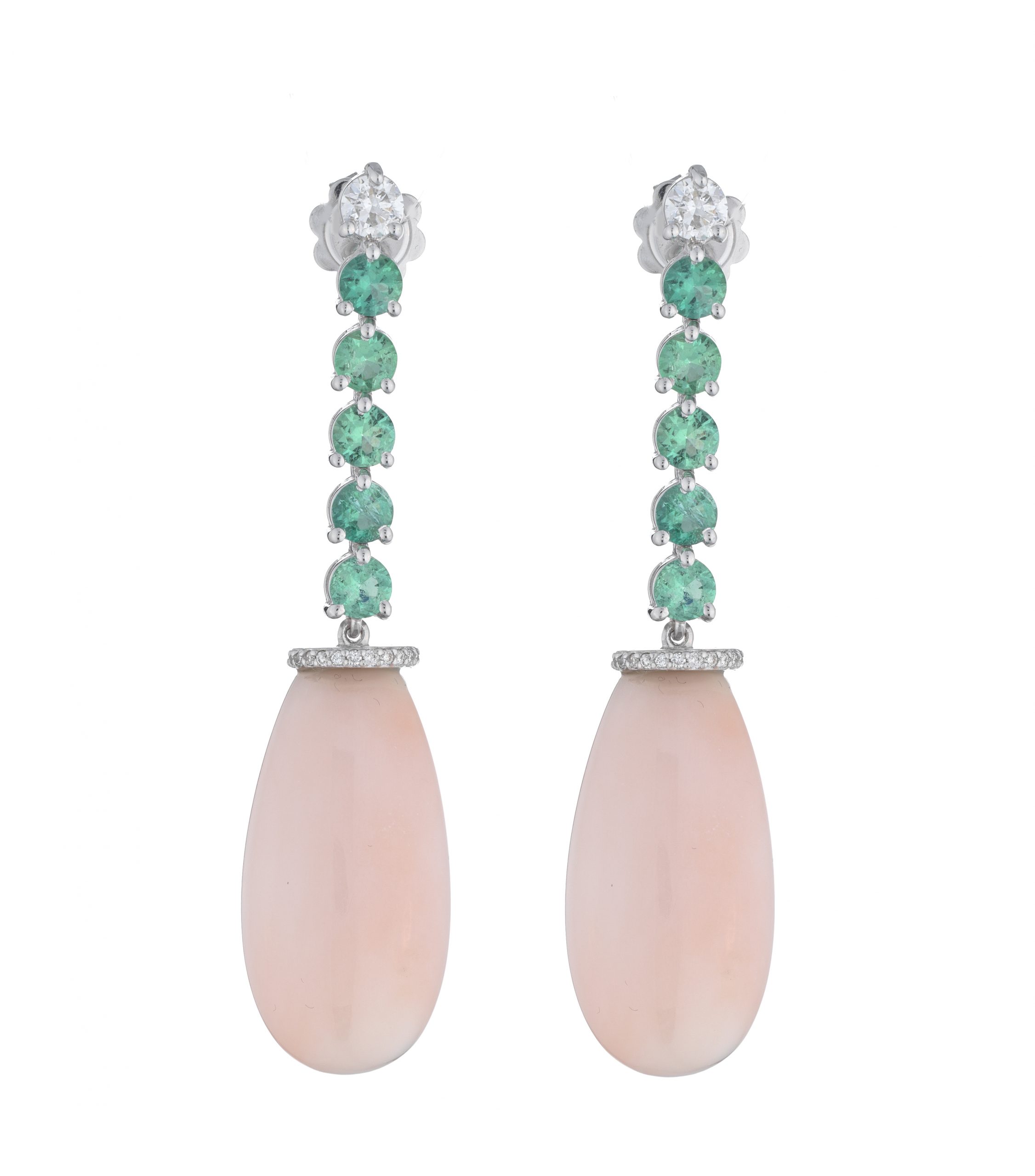 Orecchini in oro 18 kt, corallo rosa, diamanti e smeraldi