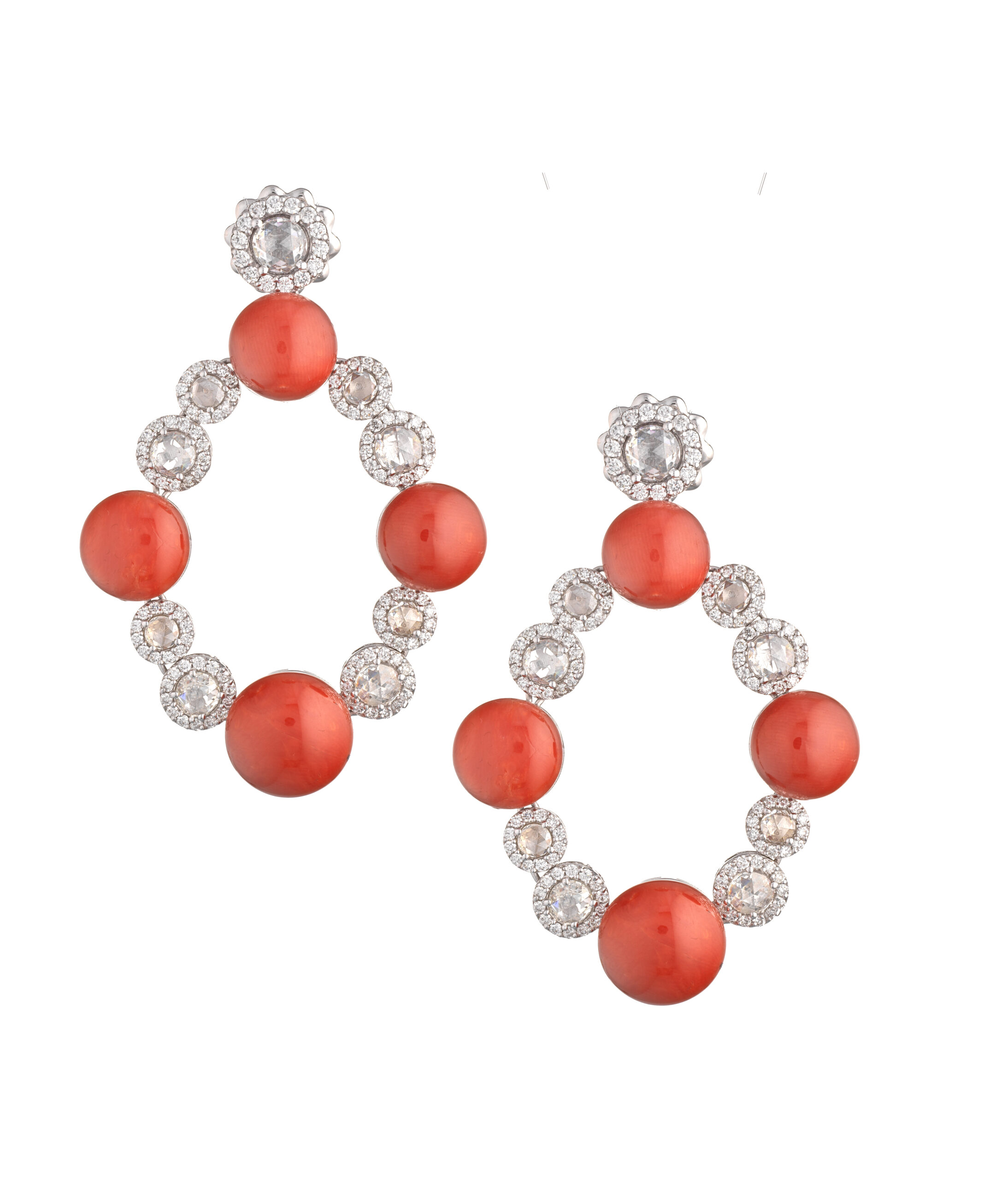 Orecchini in oro 18 kt, corallo rosso e diamanti