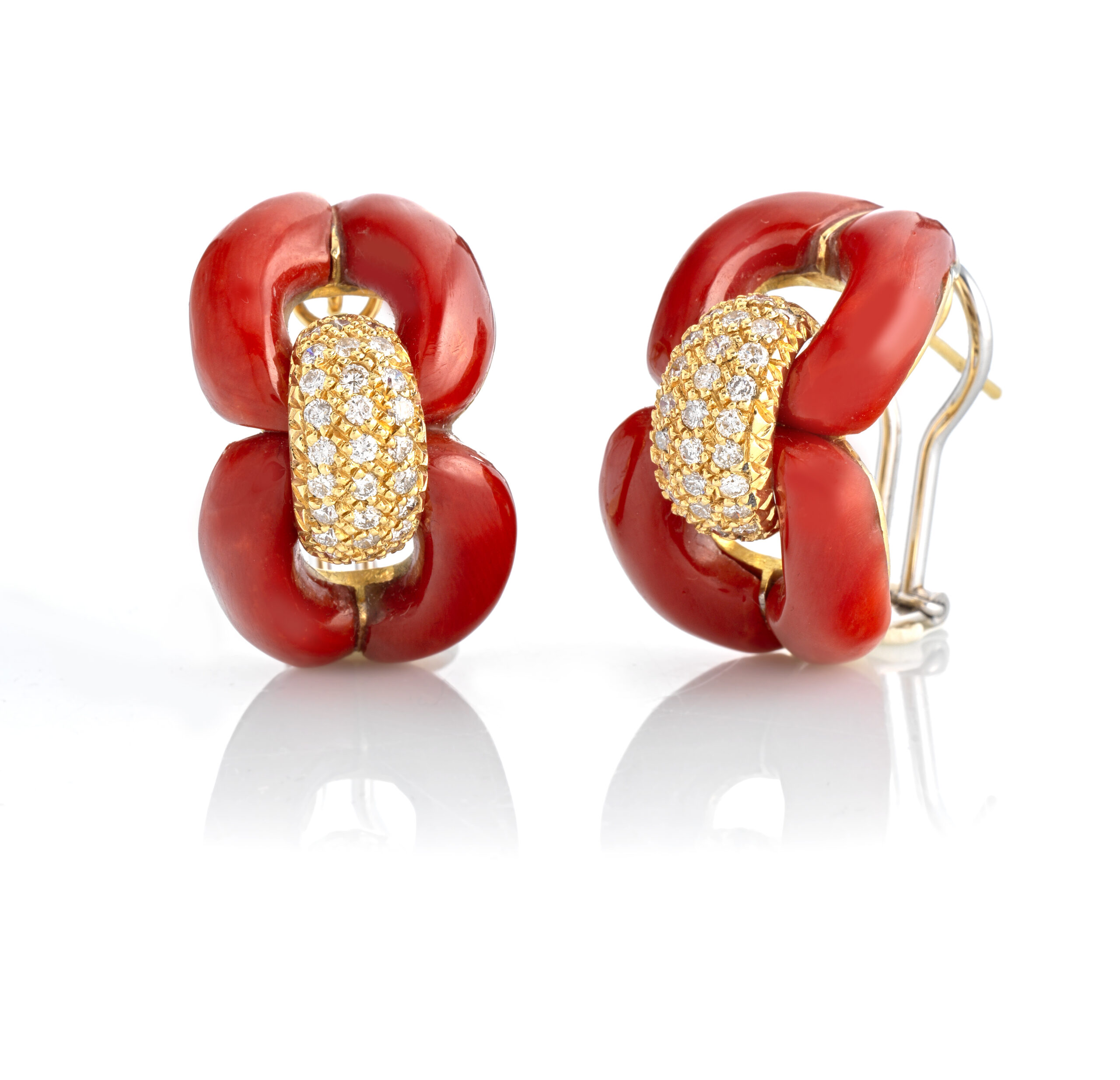 Orecchini in oro 18 kt, corallo rosso e diamanti