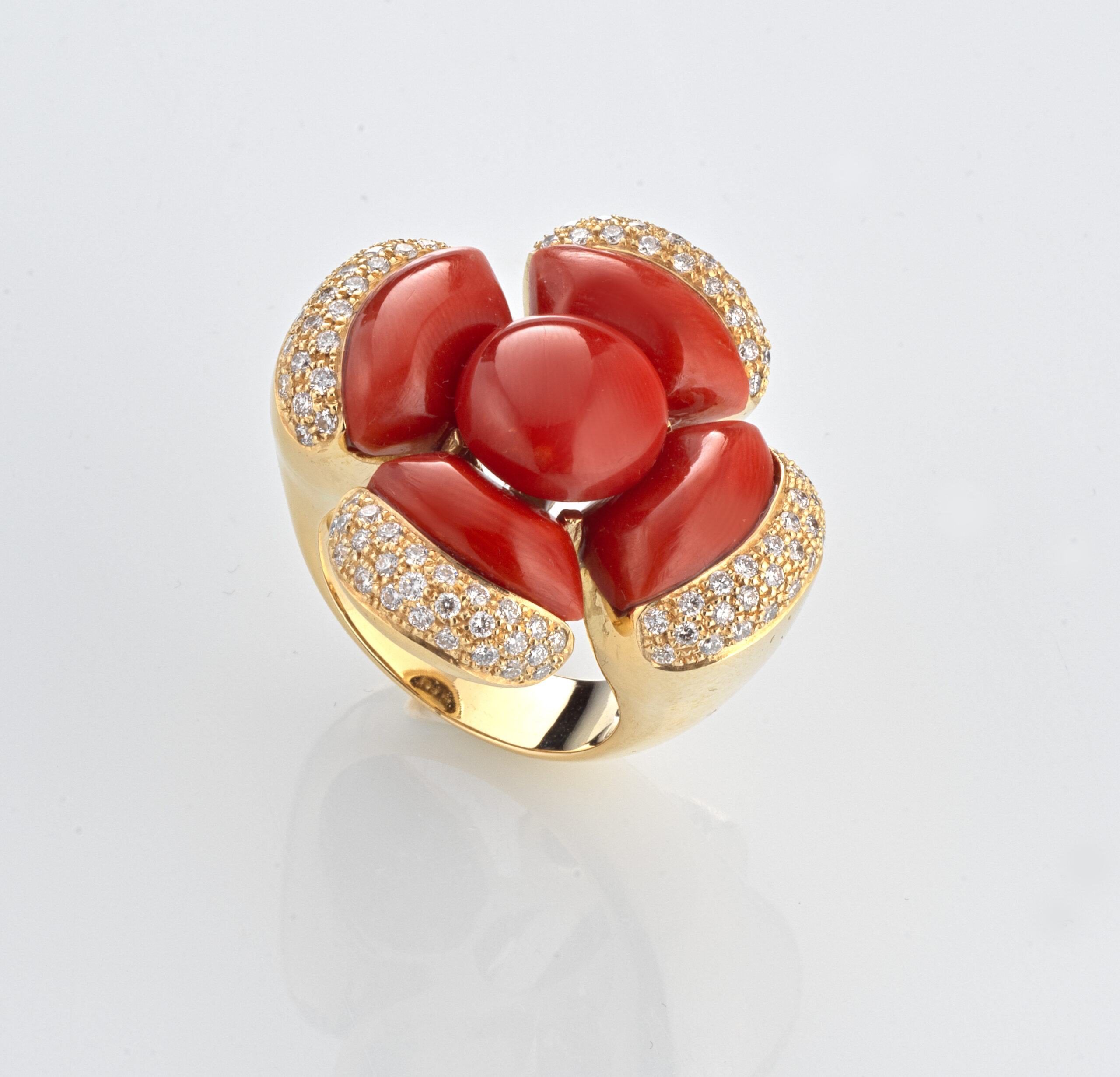 Anello in oro 18 kt con corallo rosso e diamanti kt. 1,06