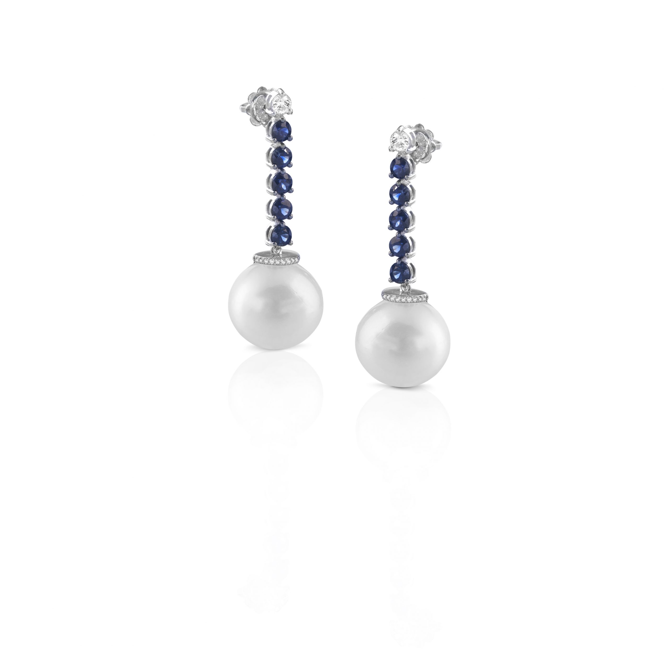 Orecchini in oro 18 kt con perle south sea, diamanti ct. 0,36 e zaffiri blu ct. 2,43