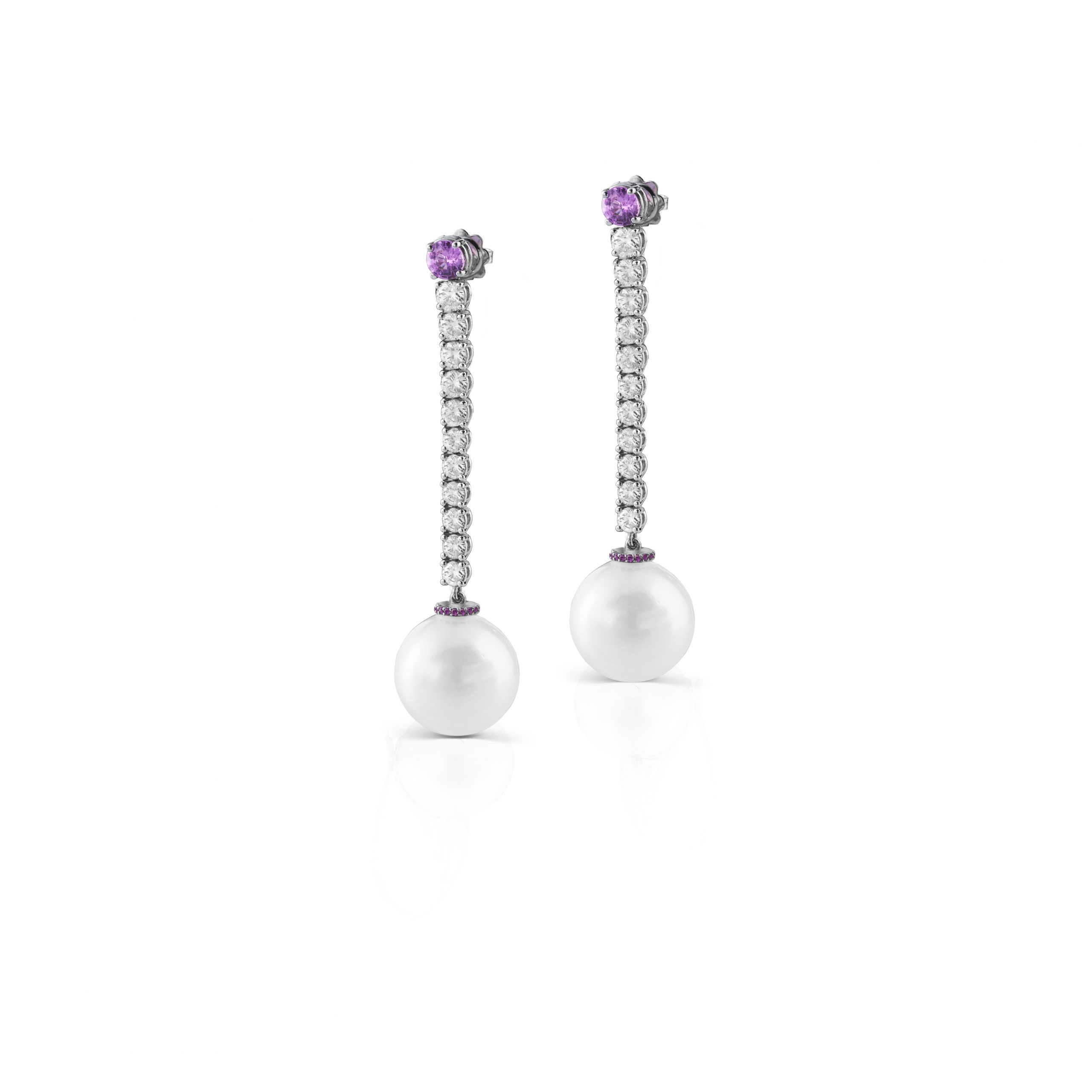 Orecchini in oro 18 kt con perle south sea, diamanti ct. 2,73 e zaffiri rosa ct. 1,32